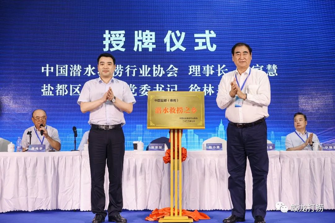 中國潛水救撈行業(yè)協(xié)會理事長宋家慧和鹽都區(qū)秦南鎮(zhèn)黨委書記徐林泉在會上為“中國鹽都(秦南)‘潛水救撈之鄉(xiāng)’”揭牌。